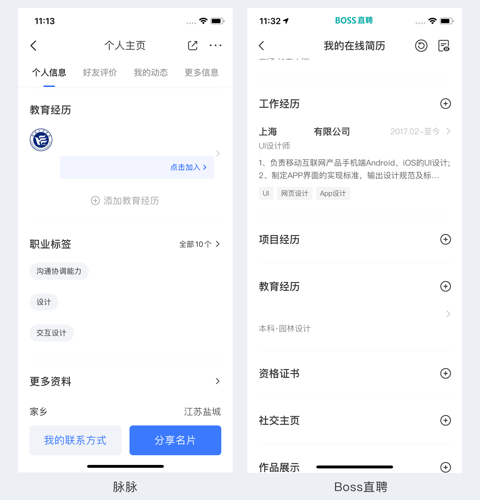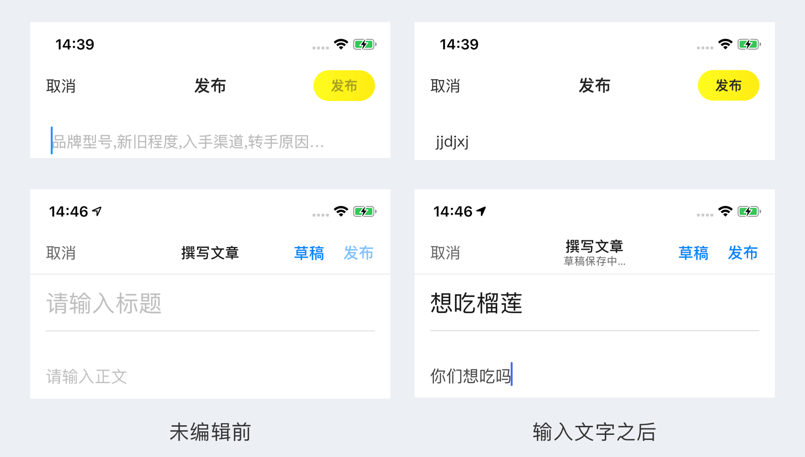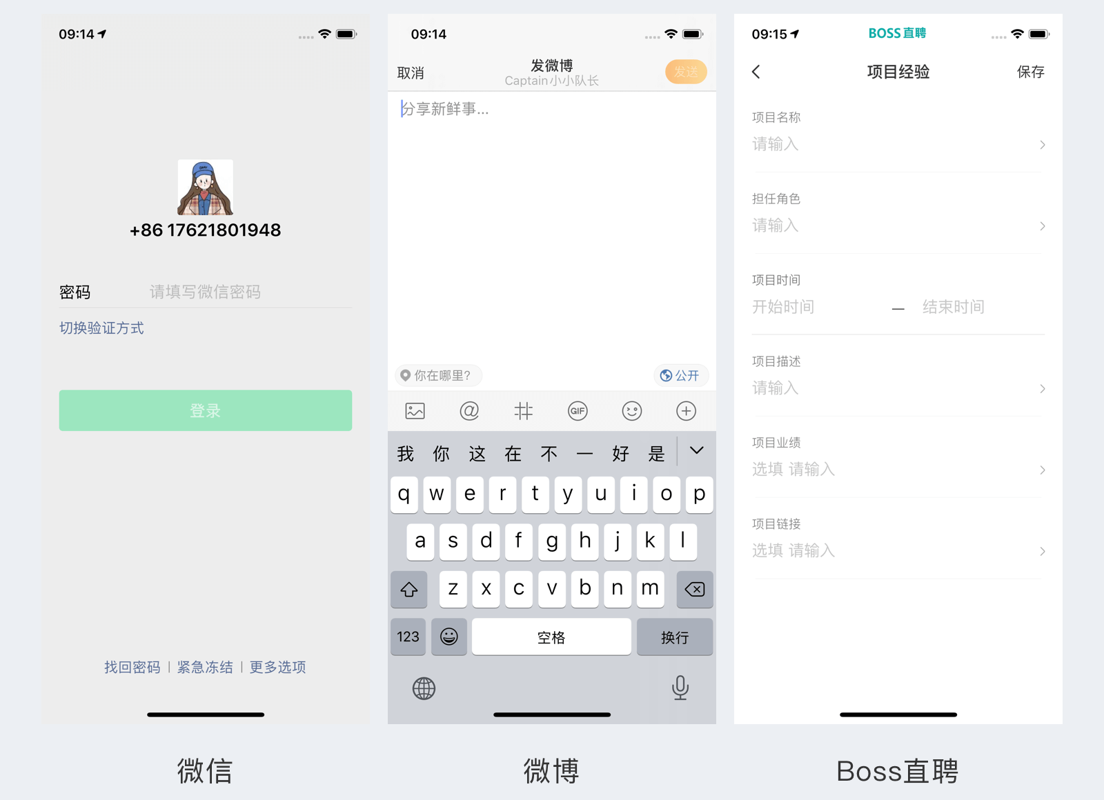 而且这里在设计的时候需要注意的一个是分割形式,上图的三个例子分别使用了背景分割和留白分割,其中留白分割在填写时使用的比较多,因为大家要注意的是在编辑状态是有很多填写提示的下划线,背景分割或者分割线分割势必会造成视觉上分割感更强,因此在编辑状态留白风格是比较好的选择办法。
