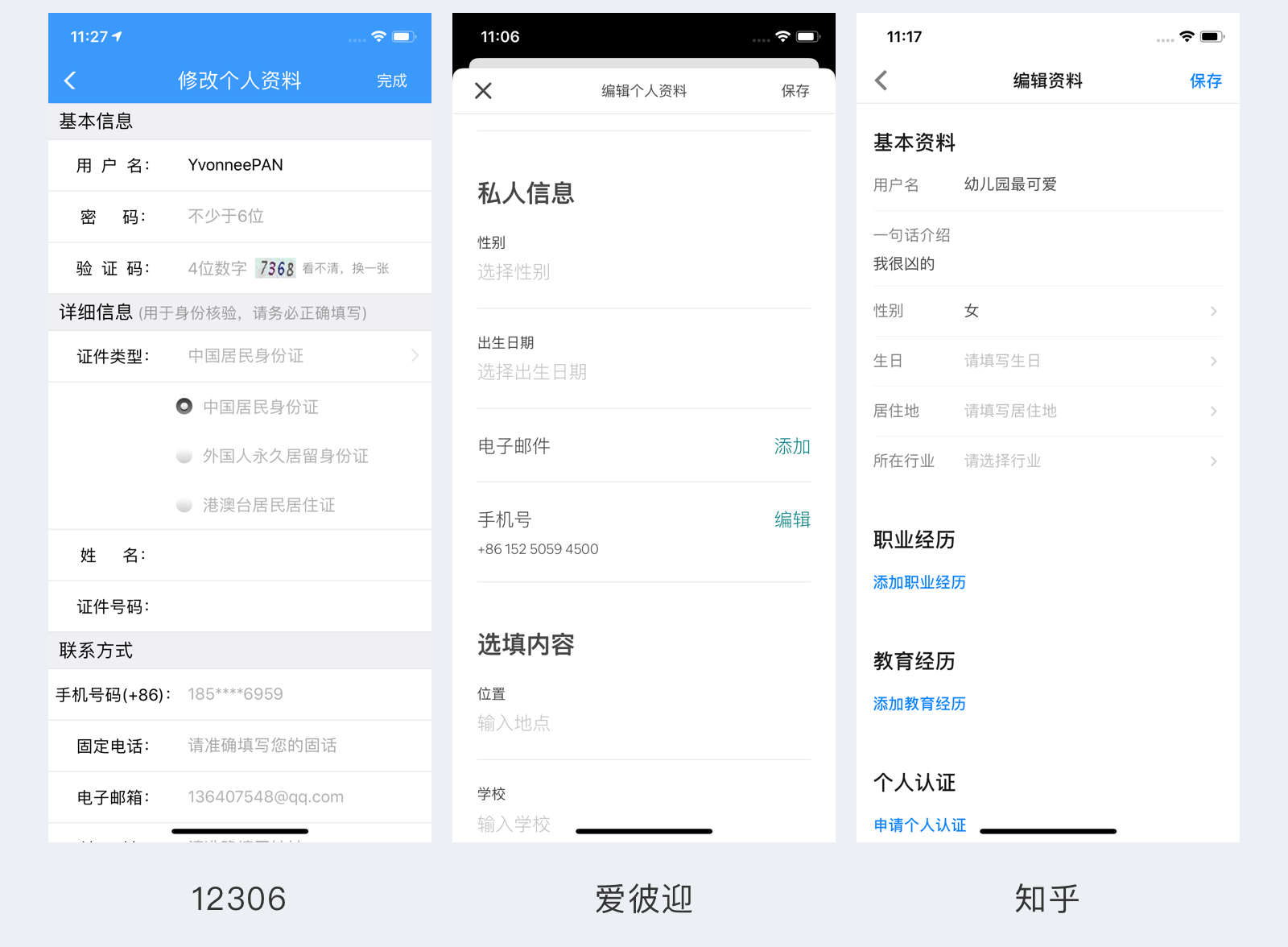 12306、爱彼迎以及知乎的个人信息填写都比较多,但是将信息分类以后,就增加了页面呼吸和节奏感,从而帮助用户更加轻松完成表单。